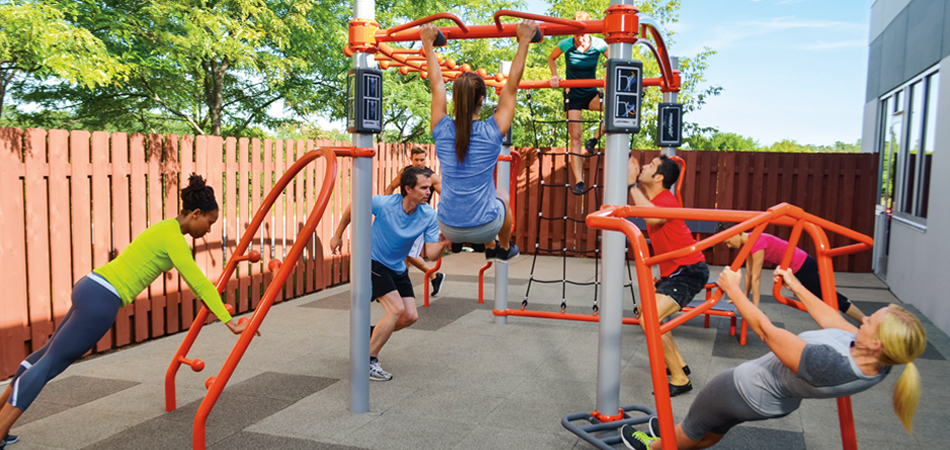 Une alternative extérieure à la SYNRGY360. L’installation de plusieurs stations d’entraînement permet d’accueillir tous les utilisateurs et les unités SYNRGY BlueSky peuvent être utilisées comme des zones d’entraînement en groupe ou des stations plus petites sur un parcours de course ou dans un parc.